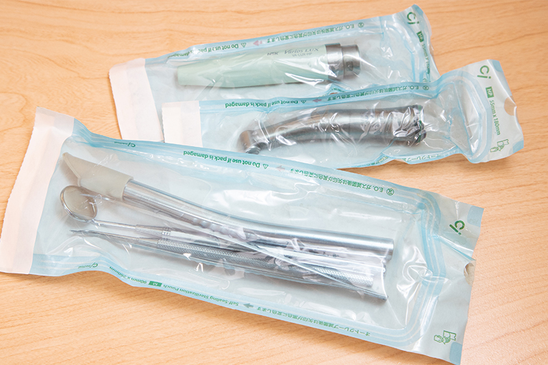 患者様のお口に触れる器具は、すべて専用の滅菌機を使用して、常に清潔な状態に保っています。また、歯を削るときに使うハンドピースも、患者様ごとに個別滅菌。滅菌が難しい器具は、ディスポーザブル(使い捨て)の製品を採用。いつでも新品の器具を使用するため安心です。